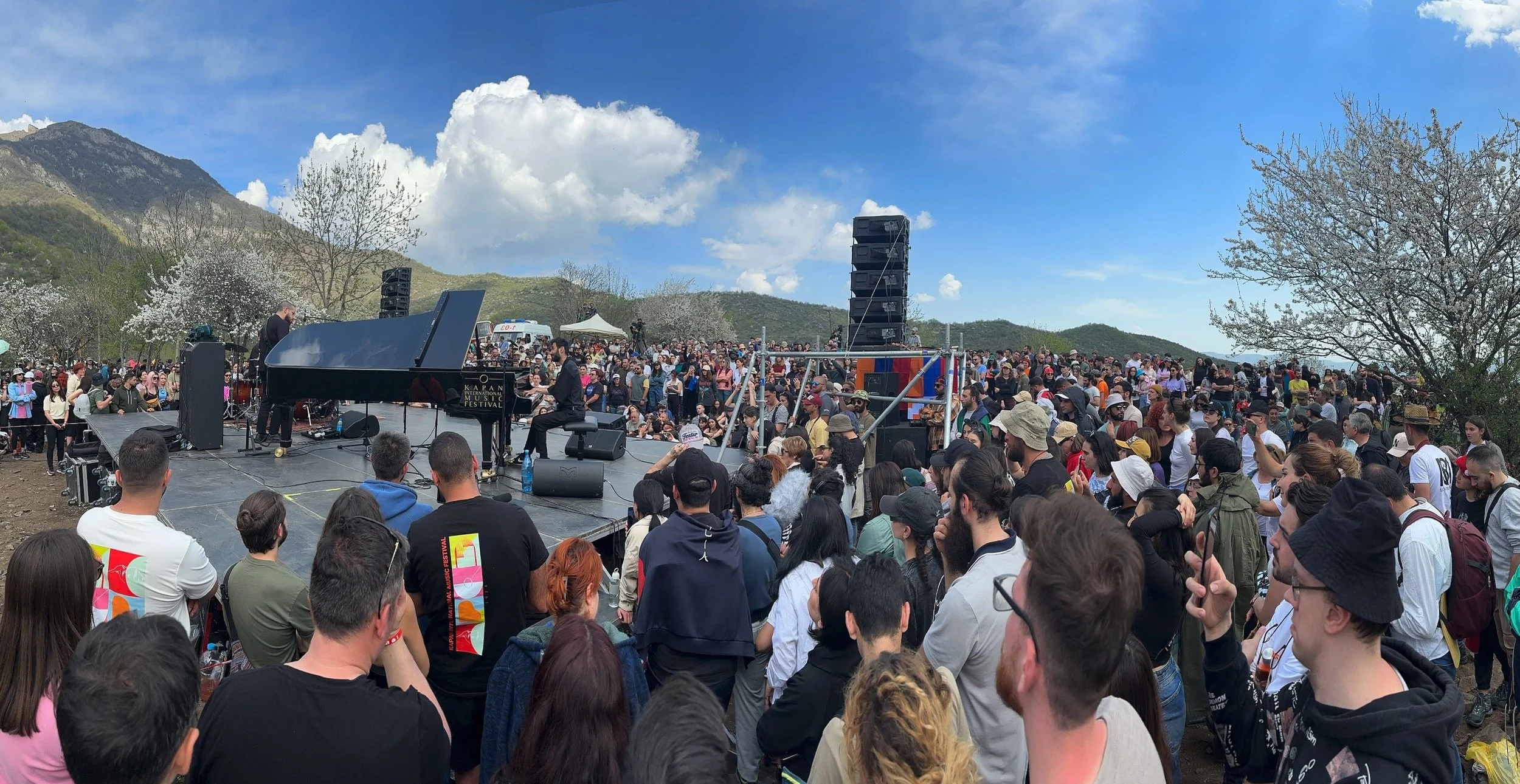 From the archive, the film shifts to the open landscape of southern Armenia. Inspired by these images, Hamasyan plays Areg and Manushak; a song about a love duet without words. A grand piano is transported by helicopter to a mountain near Kruzup, where the musicians and audience gather for a live performance at altitude. The act is both intimate and monumental: a contemporary ritual and statement staged in direct dialogue with people, land, mountain and sky.