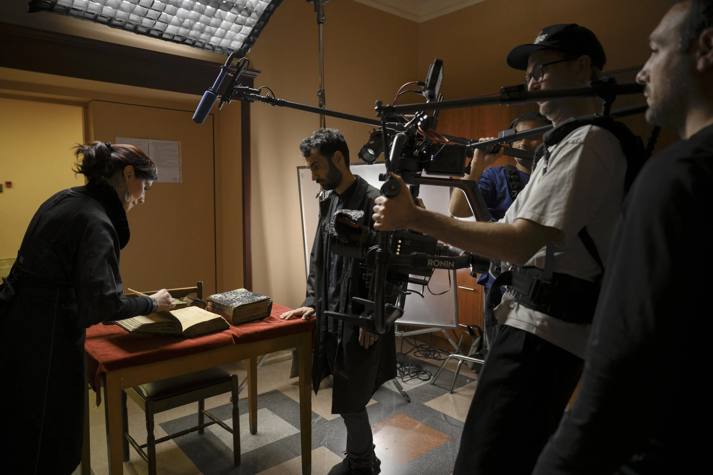 The music film Areg & Manushak begins inside the Matenadaran manuscript archive in Yerevan. In the dim corridors of this research institute, Hamasyan studies medieval Armenian manuscripts under the guidance of scholar Arusyak Tamrazian. Within a high-security vault, ancient pages reveal illustrations of anthropomorphic birds - symbols crafted by monks to encode spiritual meaning. In this encounter, music reconnects with its narrative origin.