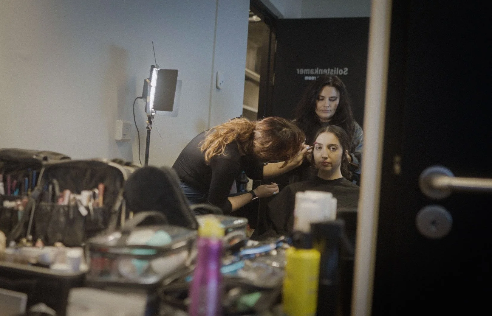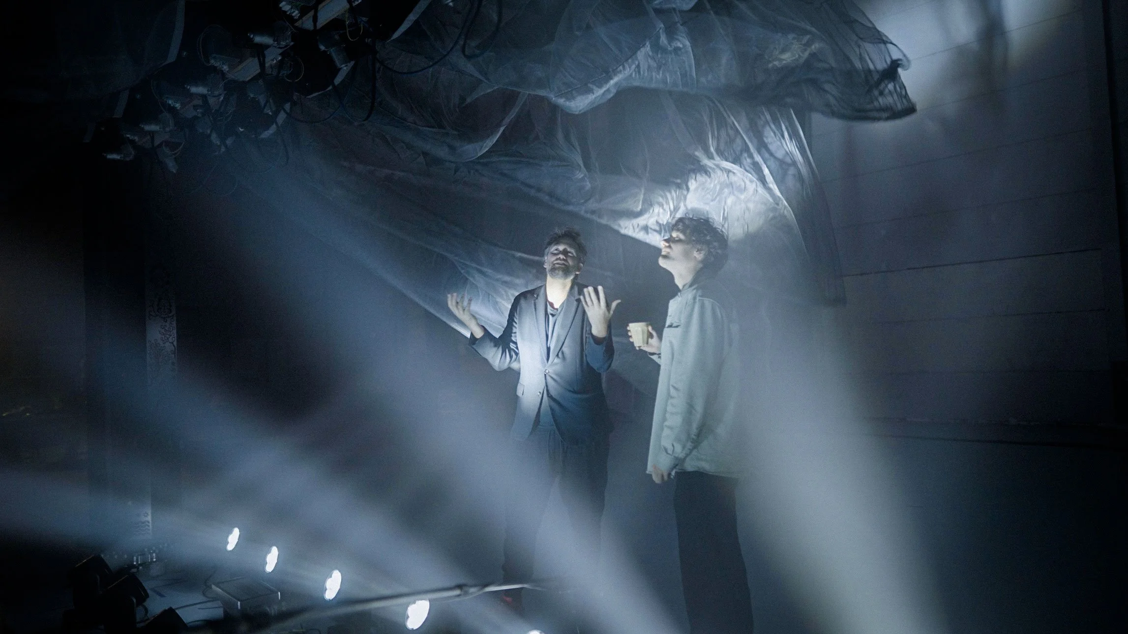 Light functions as a dramaturgical voice equal to sound and movement. A towering light totem shifts between darkness and illumination, projecting shadows across all theatre walls and immersing the audience into the story’s field. In Van Leer’s direction, light reveals and withholds in urgent measure.