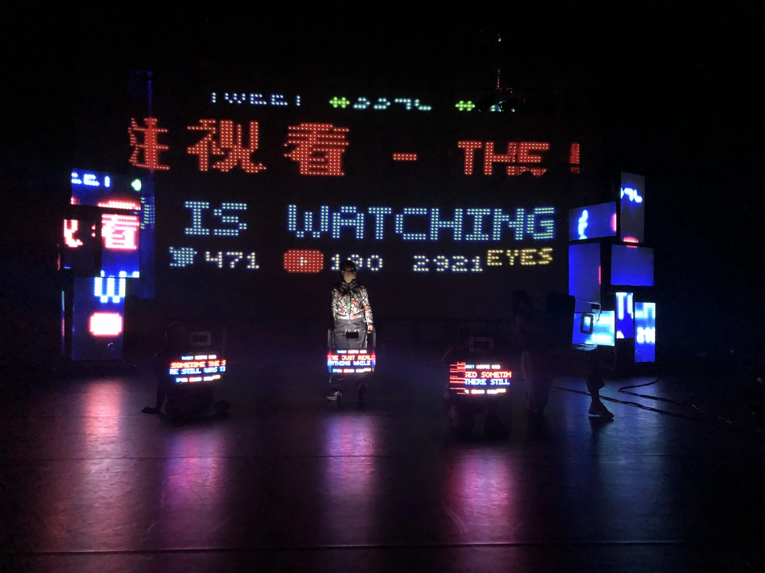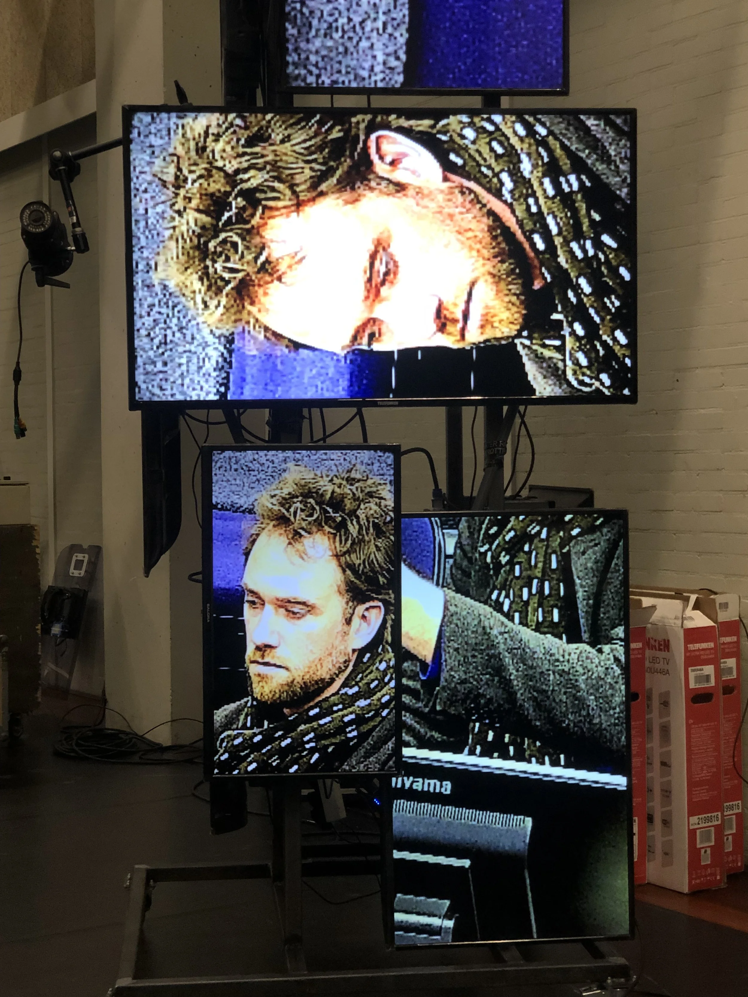 R.I.O.T. (Ready In Order To) is an interdisciplinary performance in collaboration with Alida Dors in which uprising is explored as a living system. For this work, Ruben Van Leer developed a scenographic and cinematic language where stage, camera and media architecture merge into one responsive environment. Modular screen towers, live feeds and mobile image surfaces form a fragmented visual network; echoing systems of surveillance, categorization and control.